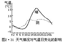 就天气情况来说,如果有云层存在,则白天地面得到的太阳辐射少,最高气温比晴天低。而在夜间,云层覆盖又不易使地面热量散失,最低气温反而比晴天高。所以阴天的气温日较差比晴天小(图2•31)。