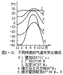 一年中月平均气温的最高值与最低值之差,称为气温年较差。气温年较差的大小与纬度、海陆分布等因素有关。赤道附近,昼夜长短几乎相等,最热月和最冷月热量收支相差不大,气温年较差很小;愈到高纬度地区,冬夏区分明显,气温的年较差就很大。例如我国的西沙群岛(16°50'N)气温年较差只有6℃,上海(31°N)为25℃,海拉尔(49°13'N)达到46.7℃。图2•32给出了不同纬度气温年变化的情况。低纬度地区气温年较差很小,高纬度地区气温年较差可达40—50℃。