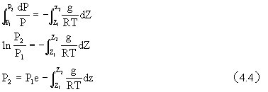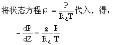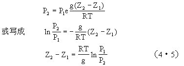 式中,P1、P2分别是高度Z1和Z2的气压值。该式表示任意两个高度上的气压差等于这两个高度间单位截面积空气柱的重量。用状态方程替换式中的ρ,得