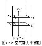 假设大气相对于地面处于静止状态,则某一点的气压值等于该点单位面积上所承受铅直气柱的重量。见图4•2,在大气柱中截取面积为1cm2,厚度为△Z的薄气柱。设高度Z1处的气压为P1,高度Z2处的气压为P2,空气密度为ρ,重力加速度为g。在静力平衡条件下,Z1面上的气压P1和Z2面上的气压P2间的气压差应等于这两个高度面间的薄气柱重量,即