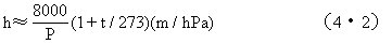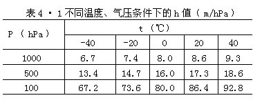 表4•l是根据(4•2)式计算出的不同气温和气压下的h值。