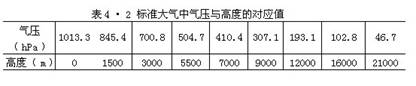 实际大气并非等温大气,所以应用(4•6)式计算实际大气的厚度和高度时,必须将大气划分为许多薄层,求出每个薄层的tm,然后分别计算各薄层的厚度,最后把各薄层的厚度求和便是实际大气的厚度。表4•2是利用(4•6)式计算的标准大气中气压与高度的对应值。