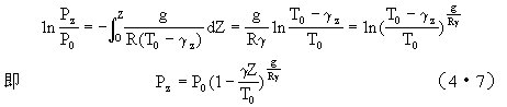 假设温度直减率(γ)不随高度变化的大气称多元大气。若取海平面的气温为T0,于是任意高度Z处的气温T=T0-γZ。令Z0=0,海平面气压为P0,任意高度Z上的气压为Pz,应用(4•4)式有
