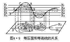 实际大气中由于下垫面性质的差异、水平方向上温度分布和动力条件的不均匀,以致同一高度上各地的气压不可能是一样的。因而等压面并不是一个水平面,而像地表形态一样,是一个高低起伏的曲面。等压面起伏形势同它附近水平面上的气压高低分布有对应关系。等压面下凹部位对应着水平面上的低压区域,等压面愈下凹,水平面上气压低得愈多。等压面向上凸起的部位对应着水平面上的高压区域,等压面愈上凸,水平面上高压愈强大。根据这种对应关系,可求出同一时间等压面上各点的位势高度值,并用类似绘制地形等高线的方法,将某一等压面上相对于海平面的各位势高度点投影到海平面上,就得到一张等位势高度线(等高线)图,此图能表示该等压面的形势,故这种图称为等压面图。见图4•9,图中P为等压面,H1、H2、H3…为高度间隔相等的若干等高面,它们分别与等压面P相截(截线以虚线表示),每条截线都在等压面P上,所以截线上各点的气压值均相等,将这些截线投影到水平面上,便得出P等压面上距海平面高度分别为H1、H2、H3…的许多等高线。由图可见,和等压面凸起部位相对应的是由一组闭合等高线构成的高值区域,高度值由中心向外递减,同理,和等压面下凹部位相对应的是由一组团合等高线构成的低值区域,高度值由中心向外递增。因此,平面图中等高线的高、低中心即代表气压的高低中心,而且等高线的疏密同等压面的缓陡相对应,等压面陡的地方,如图中A、B处,对应于A'、B'处的密集等高线,等压面平缓的地方如图中C、D处,对应于C'、D'处的稀疏等高线。