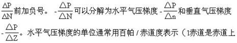 气压梯度是一个向量,它垂直于等压面,由高压指向低压,数值等于两等压面间的气压差(△P)除以其间的垂直距离(△N),用下式表达: