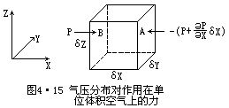 气压梯度不仅表示气压分布的不均匀程度,而且还表示了由于气压分布不均而作用在单位体积空气上的压力。为了阐明这个问题,在气柱的P和P+δP间取一小块立方体流体(图4•15),其体积是δV=δXδYδZ,