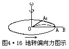 4•17,图上ω表示绕地轴转动的角速度,AC表示A点地平面的垂直轴。由于∠AOD=φ,所以∠ABC=φ,ω在地平面垂直轴方向的分量为ω1(ωsinφ)。根据圆盘转动速度所得的公式α=2Vω,可以得出任何纬度上作用于单位质量运动空气上的偏向力为: