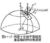 在北半球的其它纬度上,地球自转轴与地平面垂直轴的交角小于90°,因而任何一地的地平面都有绕地轴转动的角速度。见图